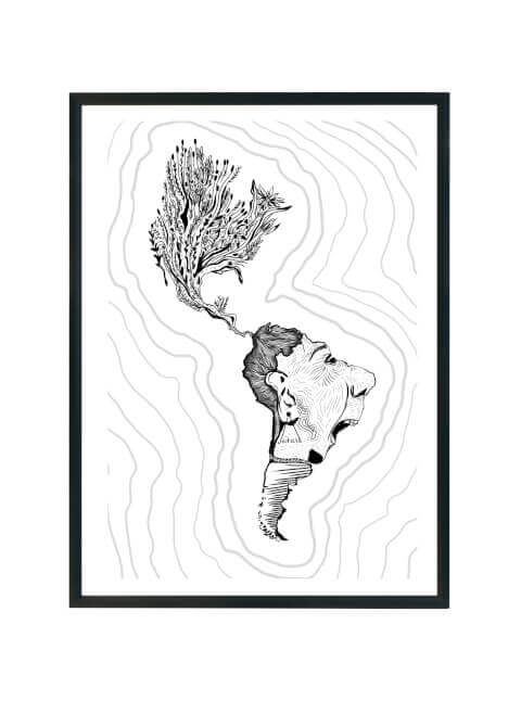 América Latina Unida est une œuvre de dessin numérique qui aborde le thème de la migration, mais aussi de la force qui nous unit et nous enveloppe en tant que continent. Elle offre une perspective féminine, avec des tracés en noir et blanc qui évoquent la nature et la profondeur de notre identité commune.