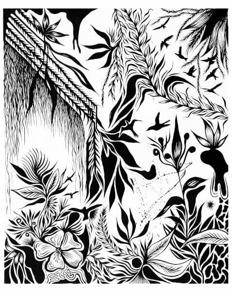 Encre de Chine sur toile 100 cm x 70 cm Ce diptyque intitulé AWA : La Lumière et l'obscurité présente essentiellement des éléments organiques, dans lesquels je m'intéresse à la sensation de légèreté et de mouvement. Dans la pièce La Lumière, je recrée la sensation d’être entouré par le vent, à travers un espace qui revient et nous emmène hors du temps. Par conséquent, la deuxième pièce, l'Obscurité, réalisée en blanc sur le noir, génère une sensation de profondeur et de densité, plutôt liée aux éléments maritimes, tandis que le poisson et les gouttes d’eau nous transportent dans un espace d’obscurité et de connexion intérieure. Ce diptyque, réalisé avec des tracés élégants, explore les thèmes de la spiritualité et de la nature, tout en mettant en lumière l’art du dessin et de la peinture. AWA évoque la notion de « Source de vie », symbolisant l’espace primordial où la vie a vu le jour, représentant ainsi la genèse de la création et l’établissement de l’harmonie sur terre.
