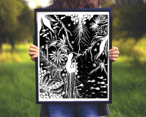 Encre de Chine sur toile 100 cm x 70 cm 2021 Ce diptyque intitulé AWA : la Lumière et l’obscurité présente essentiellement des éléments organiques, dans lesquels je m’intéresse à la sensation de légèreté et de mouvement. Dans la pièce La Lumière, je recrée la sensation d’être entouré par le vent, à travers un espace qui revient et nous emmène hors du temps. Par conséquent, la deuxième pièce, l’obscurité, réalisée en blanc sur le noir, génère une sensation de profondeur, de densité, plutôt liée aux éléments maritimes, tandis que le poisson et les gouttes d’eau nous transportent dans un espace d’obscurité et de connexion intérieure. En jouant avec des nuances de blanc et noir, cette œuvre évoque aussi la magie de la nature et notre spiritualité, soulignant la force créative que nous portons en nous. AWA signifie « Source de vie ». Je le comprends comme le premier espace où la vie est apparue, comme la source de la création et le début de l’ordre sur terre.