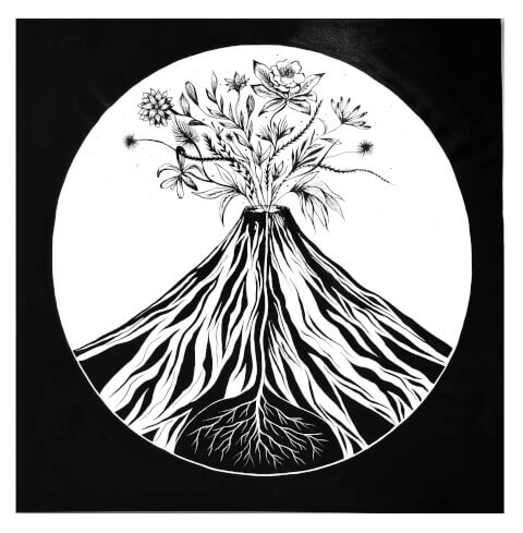 Acrylique sur toile, 100x100 cm. Je ressens que les femmes portent un volcan en elles, qui entre chaque cycle lunaire, entre en éruption. La vie éclate, révélant les plus belles comme les plus laides choses que nous cachons. Je comprends le volcan comme une métaphore de transformation, illustrant le pouvoir de la nature, de la spiritualité et de la féminité. Cette œuvre en noir et blanc, avec ses tracés élégants, capture l'essence de cette dynamique profonde et invite à la réflexion sur notre expérience humaine.