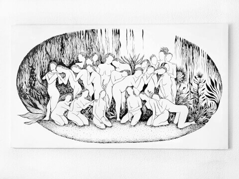 Real Humans 140x80 cm Encre sur toile 2022 Il s'agit d'une œuvre en noir et blanc inspirée par la photographie d'Angie (@angiephoto), qui a réalisé en 2021 une série de photos dédiée à la féminité dans le golfe du Yucatán, au Mexique, intitulée Real Humans. Cette série a touché des fibres profondes de mon être, et j'ai ressenti le besoin de créer une réinterprétation de son travail à travers une illustration qui évoque la nature, la spiritualité et l'élégance des tracés. Fascinée par la diversité humaine, je considère tous les corps comme beaux et admirables, avec une perfection qui va au-delà des standards de beauté que l'on nous a inculqués. Bien que la culture grecque ait imposé certains idéaux de "beauté", je crois fermement que c’est erroné, et que les corps – qu'ils soient grands, petits, minces, ronds, avec ou sans cheveux, avec ou sans poils – possèdent une beauté sans limites. Dans notre culture, les femmes sont souvent obligées de se conformer à des normes qui ne reflètent pas nécessairement qui nous sommes ou voulons être. C'est pourquoi je trouve essentiel de soutenir et de créer des projets qui remettent en question ces canons. Avec Real Humans, je souhaite contribuer à cette démarche en célébrant la féminité et l’unicité de chaque être humain, dans une œuvre où la nature et la spiritualité s’entremêlent avec la finesse des tracés en noir et blanc.