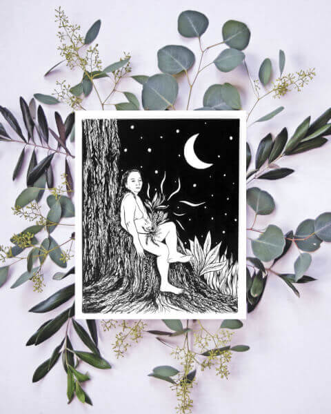 Cette œuvre en blanc et noir représente une femme assise au milieu de plantes, explorant la nature et la spiritualité. À travers des tracés fins et élégants, chaque détail révèle une profondeur qui invite à la contemplation, offrant une connexion intime avec l'essence de la vie et la beauté de l'environnement.